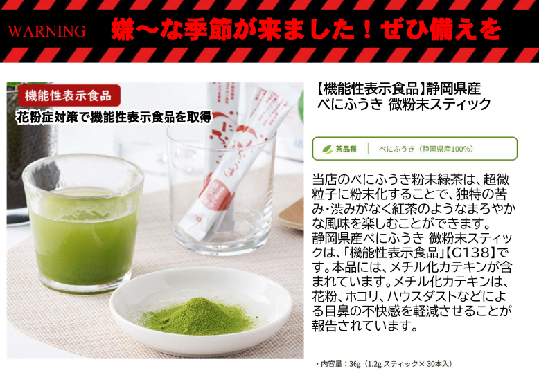 「【機能性表示食品】べにふうき微粉末スティック」について、花粉シーズン向けのPOPを更新しました。