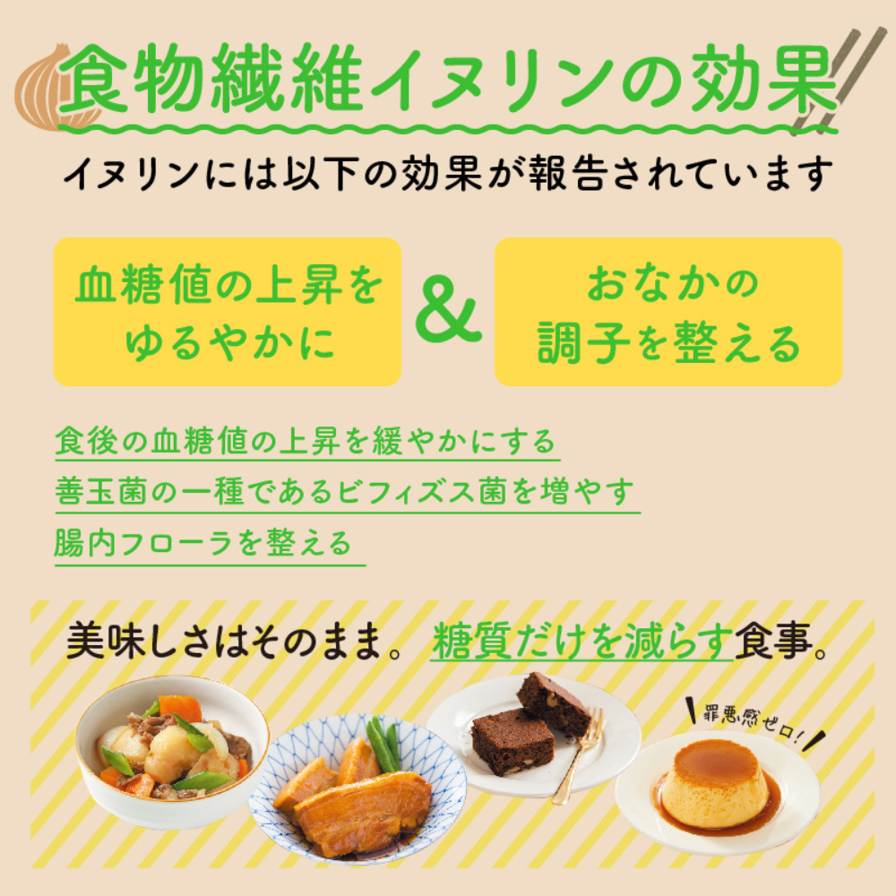 | 特記事項 | 【機能性表示食品】 ■届出表示:本品にはイヌリンが含まれています。 イヌリンは食後の血糖値の上昇をゆるやかにすること、善玉菌の一種であるビフィズス菌を増やし、 腸内フローラを整えることでお通じを改善しおなかの調子を整えることが報告されています。 本品は食後の血糖値が気になる方、腸内環境を改善したい方、お通じを改善しおなかの調子を整えたい方に適した食品です。 ■本品は、事業者の責任において特定の保健の目的が期待できる旨を表示するものとして、消費者庁長官に届出されたものです。 ただし、特定保健用食品と異なり、消費者庁長官による個別審査を受けたものではありません。 ■届出番号:G812 ■本品は、疾病の診断、治療、予防を目的としたものではありません。 ■本品は、疾病に罹患している者、未成年者、妊産婦(妊娠を計画している者を含む。)及び授乳婦を対象に開発された食品ではありません。 ■取扱上の注意:多量に摂取することにより、より健康が増進するものではありません。1日摂取目安量を守ってお召し上がりください。 ■食生活は、主食、主菜、副菜を基本に、食事のバランスを。 ■疾病に罹患している場合は医師に、医薬品を服用している場合は医師、薬剤師に相談してください。 ■体調に異変を感じた際は、速やかに摂取を中止し、医師に相談してください。 ■1日摂取目安量:1回の食事で10g(大さじ約1杯) ■賞味期限:袋に記載 ■保存方法:開封後は必ずチャックで密封し、湿気を避けて保存してください。 |