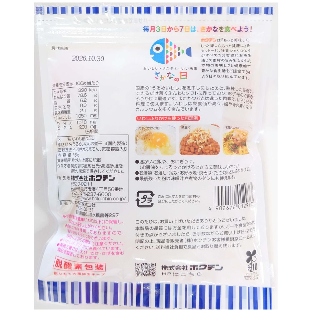 | おすすめポイント | 原材料がうるめいわしのみ。歯や骨を丈夫にするカルシウムも豊富に含まれています。 小さなお子様からご年配の方まで美味しくお召し上がりいただけます。 チャック袋の大袋タイプと小分けの使い切りパックで使い勝手も良く、持ち運びも便利。 いつでもどこでも手軽にご利用できます。 |
