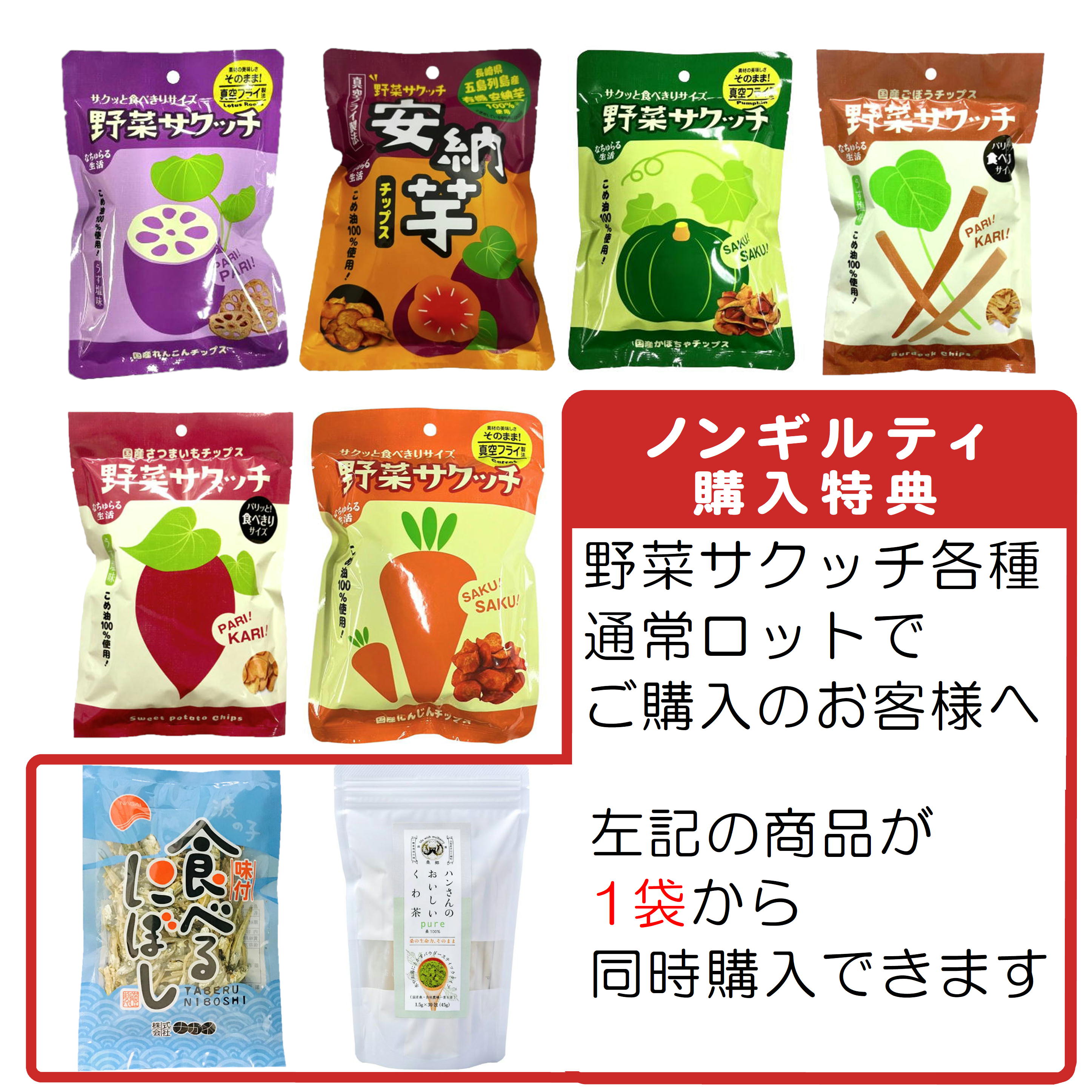 | 成分・素材 | 【有機安納芋チップス】有機安納芋(長崎県)、こめ油(国産) 【国産れんこんチップス】れんこん、こめ油、食塩 【国産かぼちゃチップス】かぼちゃ、こめ油 【国産にんじんチップス】にんじん、こめ油 【国産さつまいもチップス】さつまいも、こめ油、食塩 【国産ごぼうチップス】ごぼう、こめ油、食塩 |