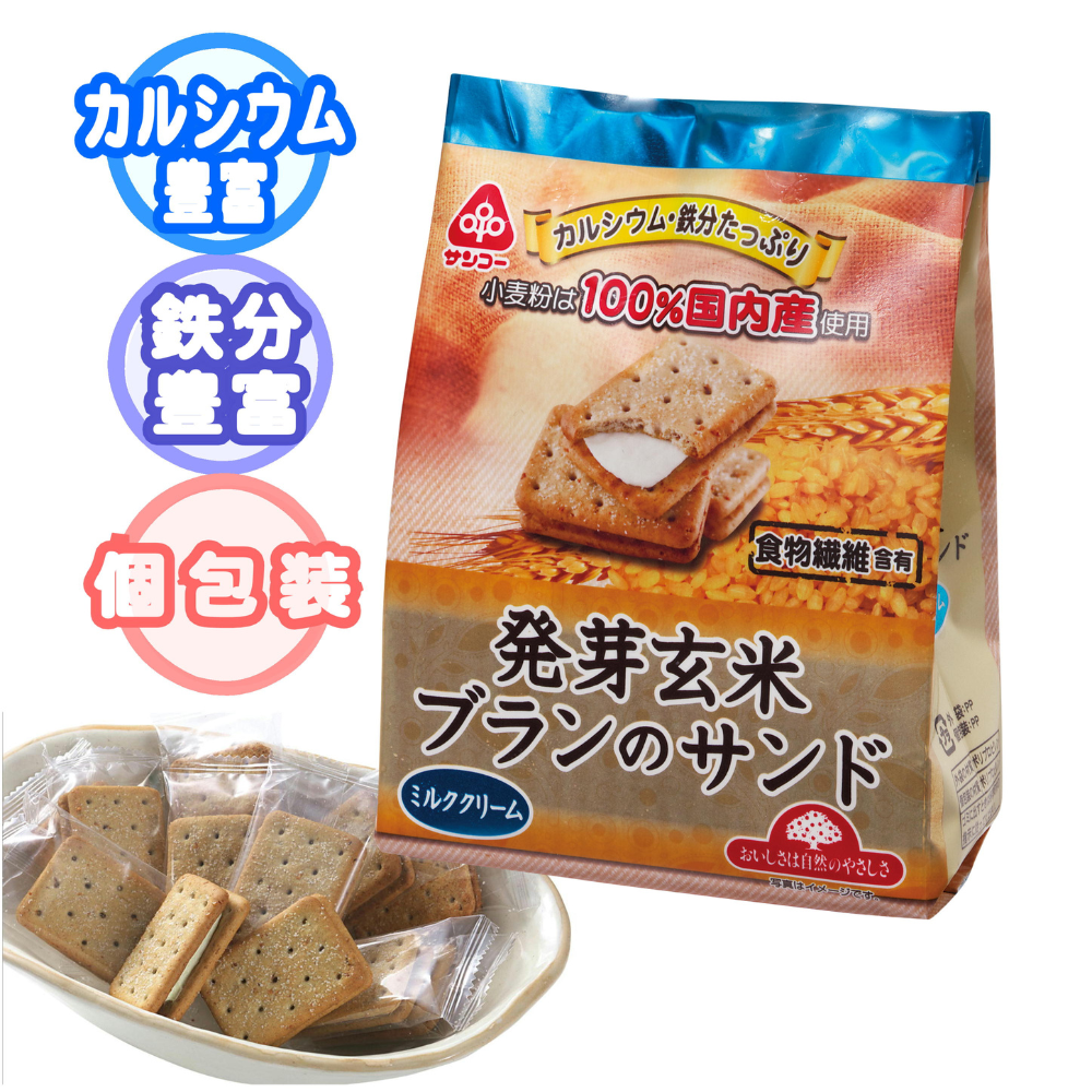 カルシウム・鉄分がたっぷり食物繊維を含む小麦ふすま(ブラン)と粗挽き焙煎発芽玄米を練り込んだ香ばしいビスケットで、ミルク風味のクリームをサンドしました。【ミレービスケット ノンフライ】