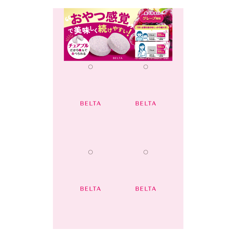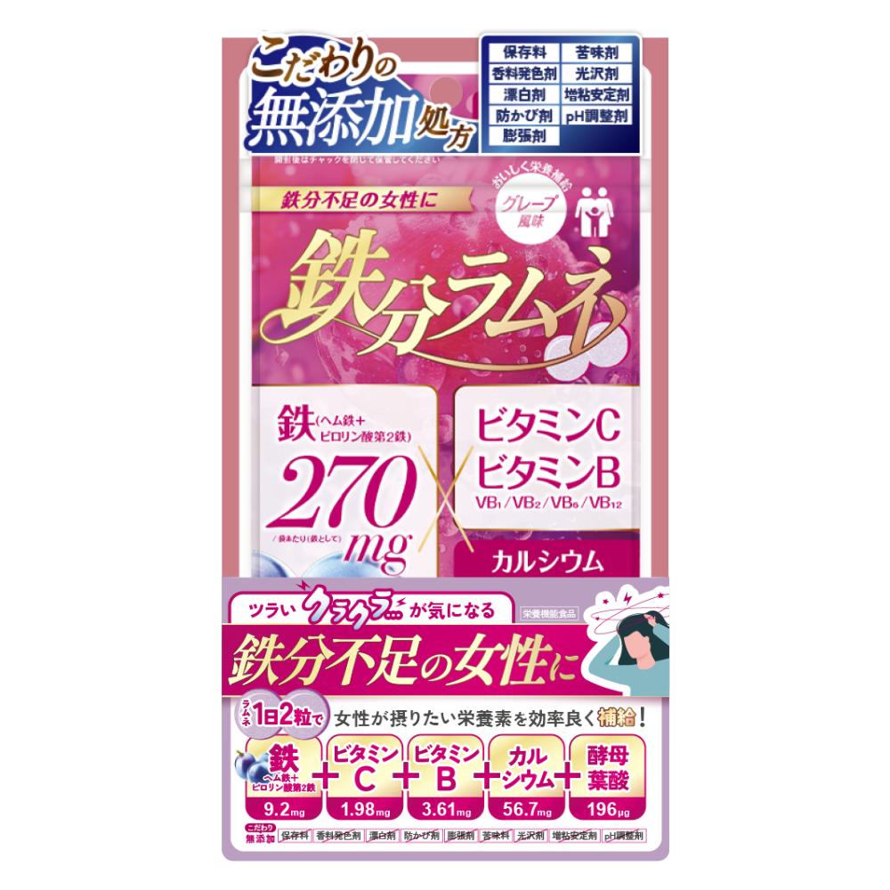 | 素材 | 砂糖(国内製造)、ドロマイト、還元麦芽糖水飴、コーンスターチ、酵母(葉酸含有)、粉末リンゴ酢、ハチミツパウダー/香料、ピロリン酸第二鉄、ヘム鉄、ステアリン酸Ca、微粒二酸化ケイ素、クエン酸、甘味料(アスパルテーム・L-フェニルアラニン化合物、ステビア)、結晶セルロース、ブドウ果皮色素、酸味料、ビタミンC、プルラン、ビタミンB₂、ビタミンB₆、ビタミンB₁、葉酸、ビタミンB₁₂、(一部にりんご・乳成分・豚肉を含む) | ||||||||||||||