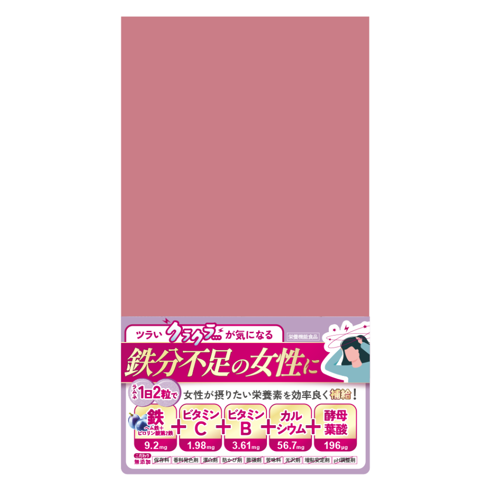 管理栄養士監修のもと、吸収率の高いヘム鉄をはじめ、カルシウムやビタミンB群、ビタミンC、葉酸など、不足しがちな栄養素をバランス良く配合しています。