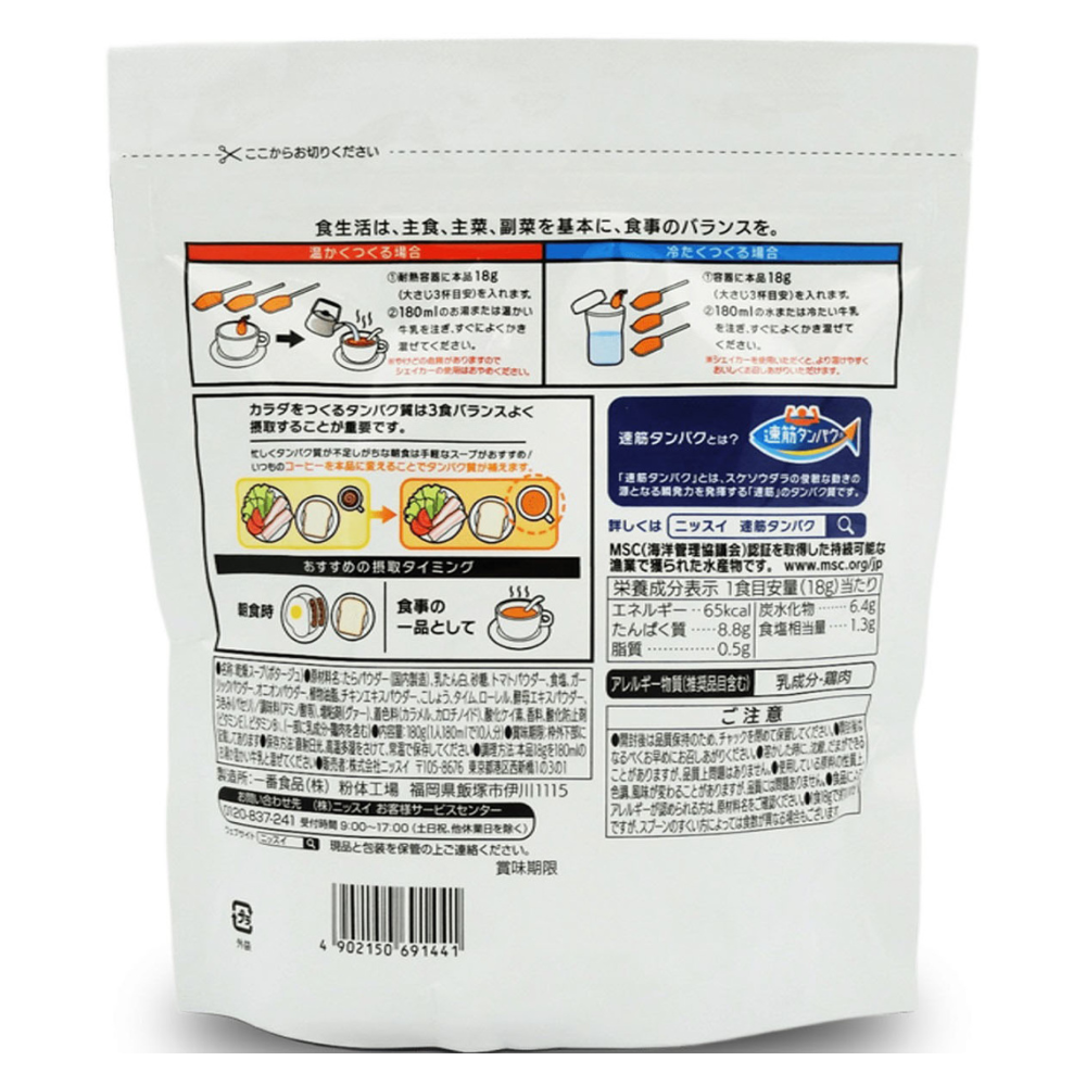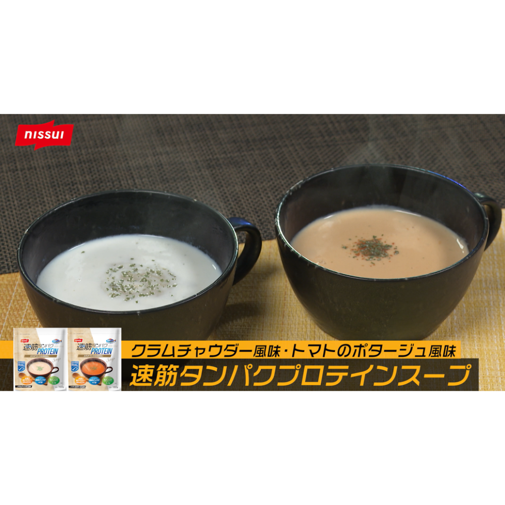 | おすすめポイント | ・カラダをつくるタンパク質は3食バランスよく摂取することが重要です。忙しくタンパク質が不足しがちな朝食にお湯で溶かすだけで手軽でおいしいスープです。お好みで、冷たいお水や牛乳で溶かして、冷製スープとしてもお召あがりいただけます。 ・クラムチャウダー風味では1食16g当たり、トマトのポタージュ風味では1食18g当たり、速筋タンパクが4.5g、乳タンパク(ホエイ&カゼイン)が3.2g摂れます。 |