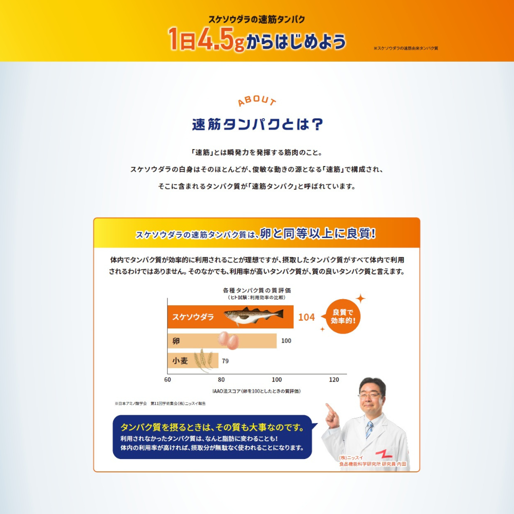 クラムチャウダー風味では1食16g当たり(1日目安量)、トマトのポタージュ風味では1食18g当たり(1日目安量)、速筋タンパクが4.5g摂取できます。