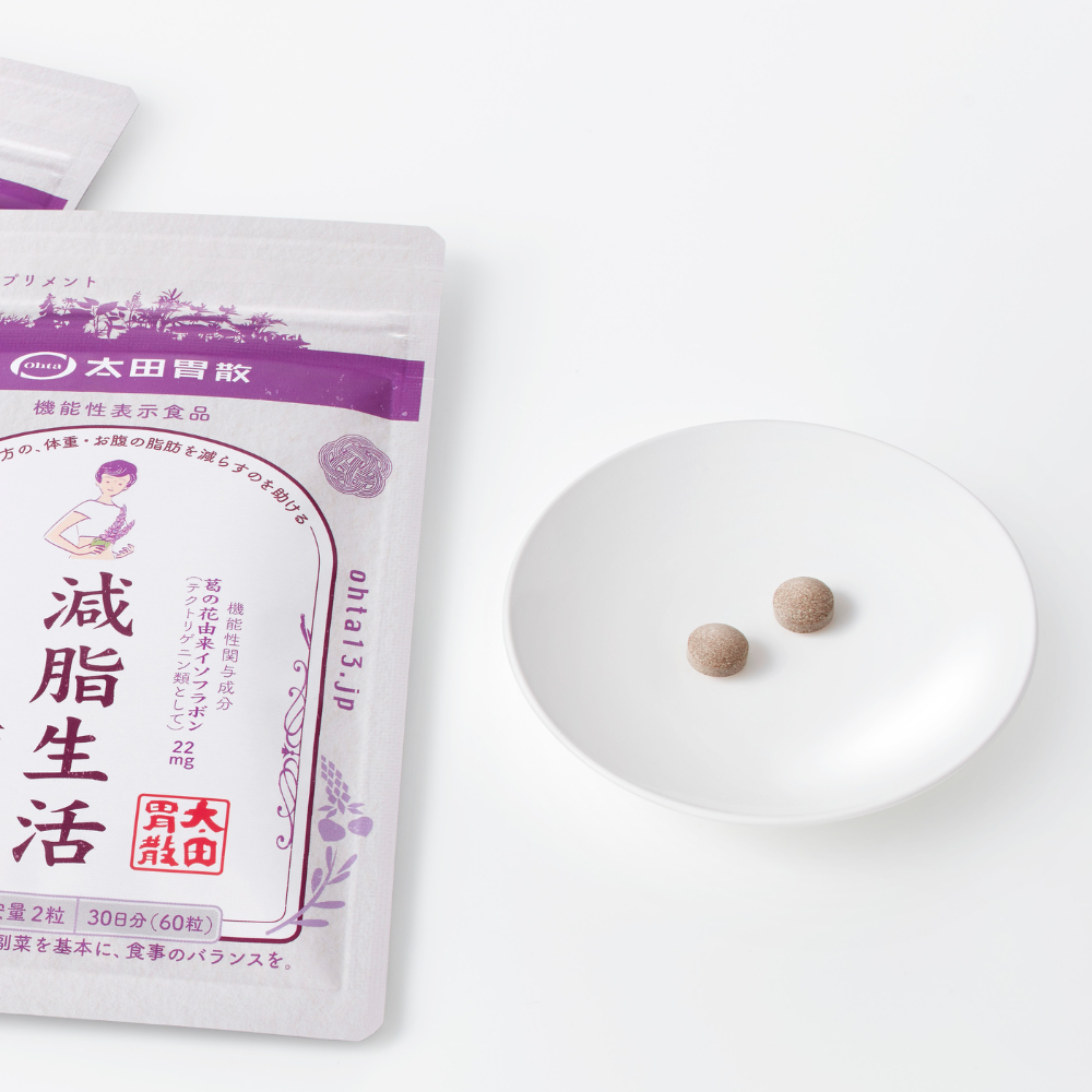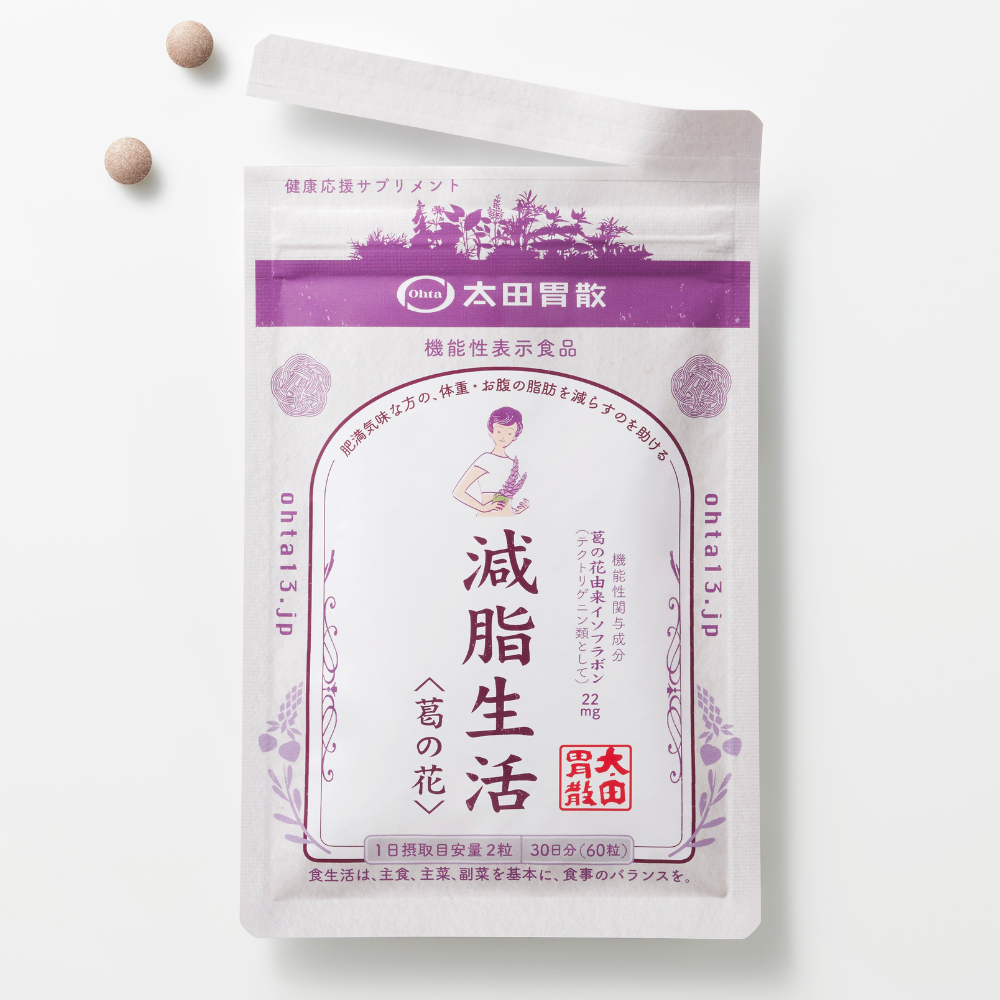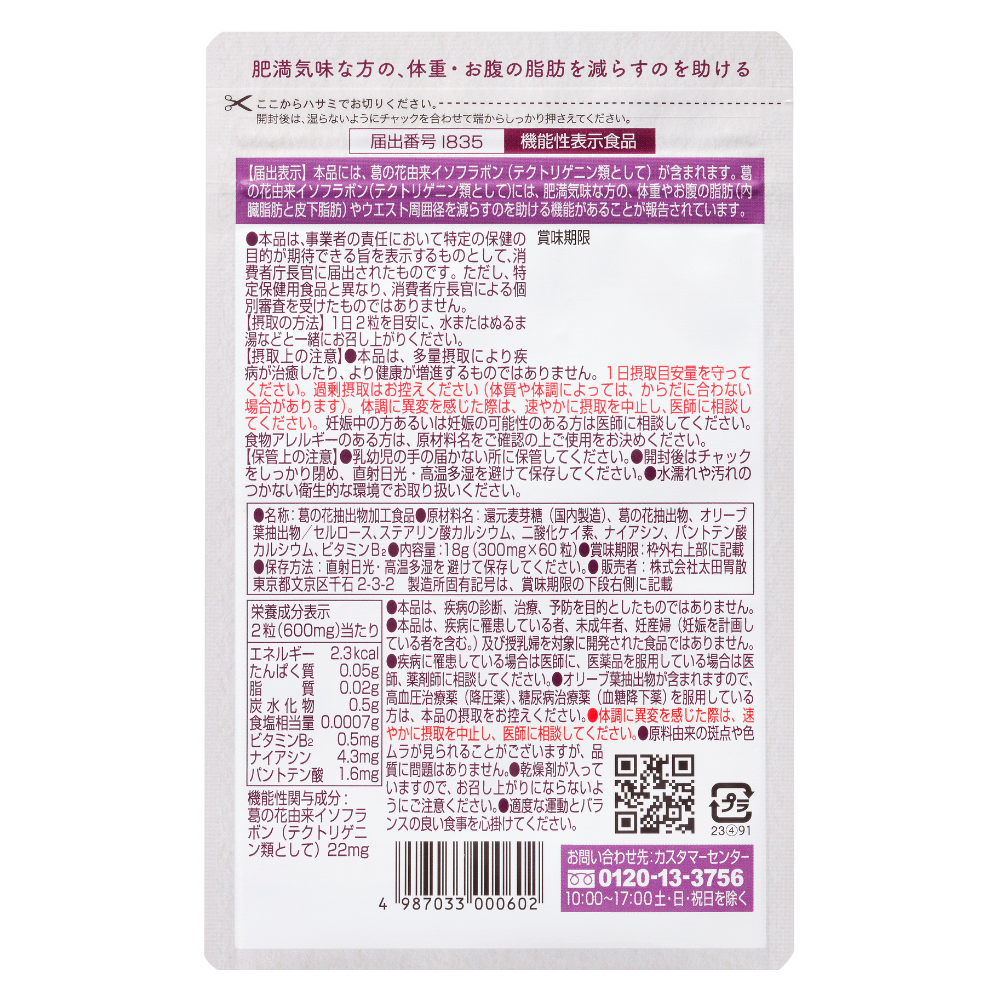 | 特記事項 | 【機能性表示食品】 ・届出表示:本品には、葛の花由来イソフラボン(テクトリゲニン類として)が含まれます。葛の花由来イソフラボン(テクトリゲニン類として)には、肥満気味な方の、体重やお腹の脂肪(内臓脂肪と皮下脂肪)やウエスト周囲径を減らすのを助ける機能があることが報告されています。 ・本品は、事業者の責任において特定の保健の目的が期待できる旨を表示するものとして、消費者庁長官に届出されたものです。ただし、特定保健用食品と異なり、消費者庁長官による個別審査を受けたものではありません。 ・届出番号:I835 本品は、疾病の診断、治療、予防を目的としたものではありません。 ・本品は、疾病に罹患している者、未成年者、妊産婦(妊娠を計画している者を含む。)及び授乳婦を対象に開発された食品ではありません。 ・疾病に罹患している場合は医師に、医薬品を服用している場合は医師、薬剤師に相談してください。 ・体調に異変を感じた際は、速やかに摂取を中止し、医師に相談してください。食生活は、主食、主菜、副菜を基本に、食事のバランスを。 ・1日当たりの摂取目安量:2粒 ・摂取上の注意:本品は、多量摂取により疾病が治癒したり、より健康が増進するものではありません。一日摂取量目安を守ってください。過剰摂取はお控えください(体質や体調によっては、からだに合わない場合があります)。体調に異変を感じた際は、速やかに摂取を中止し、医師に相談してください。 ・オリーブ葉抽出物が含まれますので、高血圧治療薬(降圧薬)、糖尿病治療薬(血糖降下薬)を服用している方は、本品の摂取をお控えください。 ・摂取の方法:水またはぬるま湯などと一緒にお召し上がりください。 |