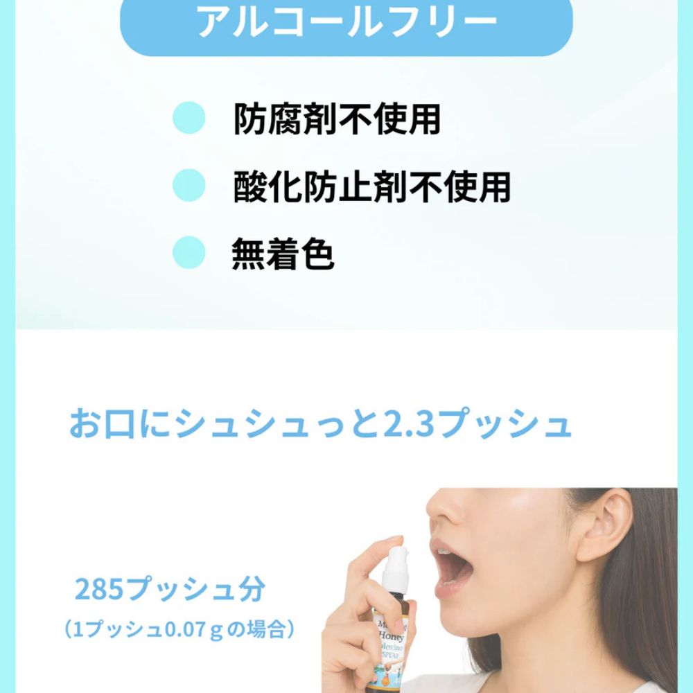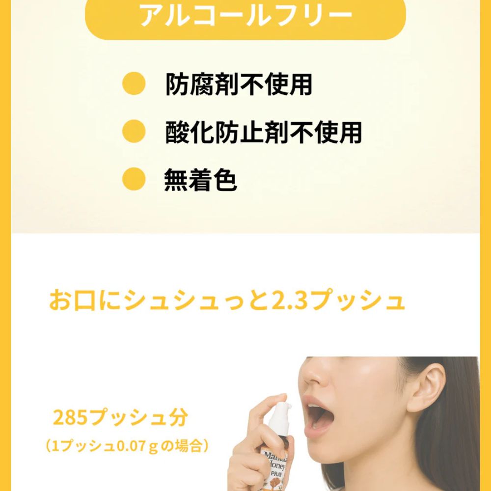 | 成分・素材 | マヌカハニースプレー(無香料)はちみつ(ニュージーランド)、グリセリンマヌカハニースプレーM(メントール)はちみつ(ニュージーランド)、グリセリン、メントール |