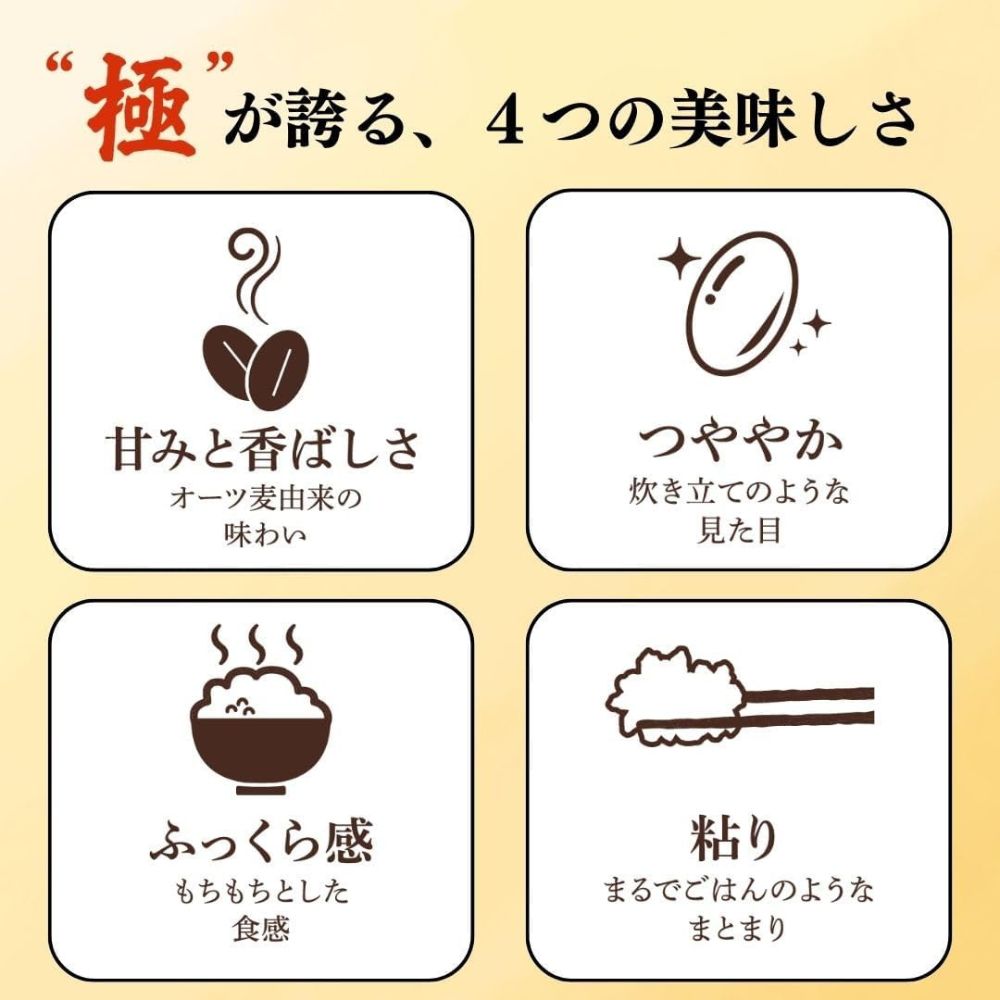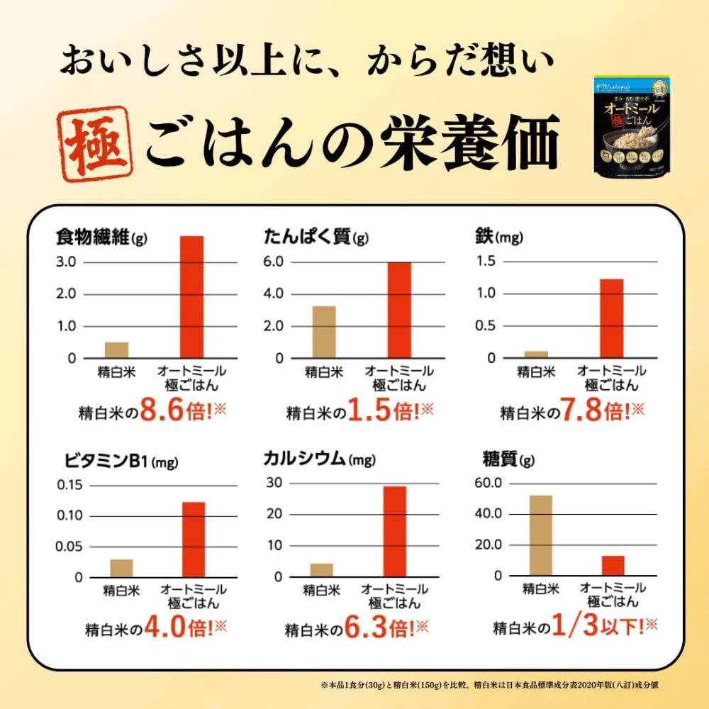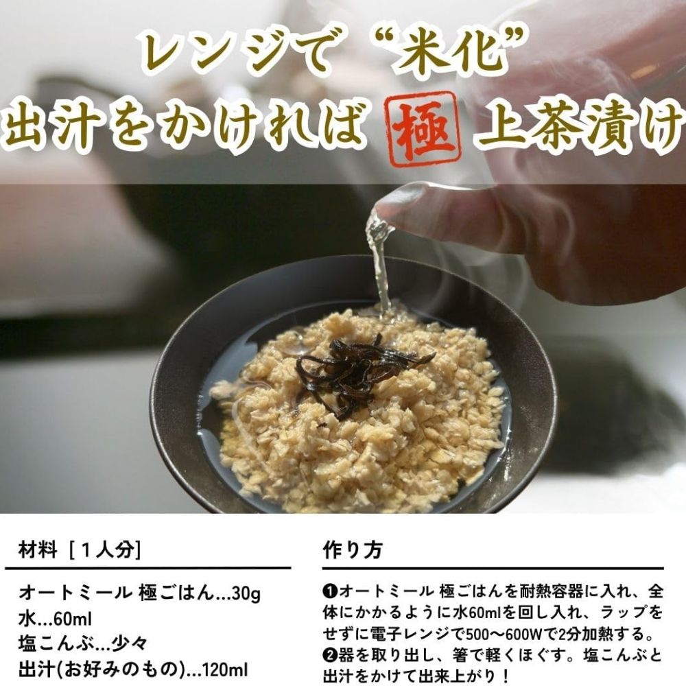 | 使い方 | [材料]極ごはん30g、水60ml [作り方] 1.オートミール極ごはん30gを耐熱容器に入れ、全体にかかるように水60mlを回し入れる。 2.ラップをせず、500~600Wの電子レンジで2分加熱する。 3.器を取り出し、箸で軽くほぐして完成! |