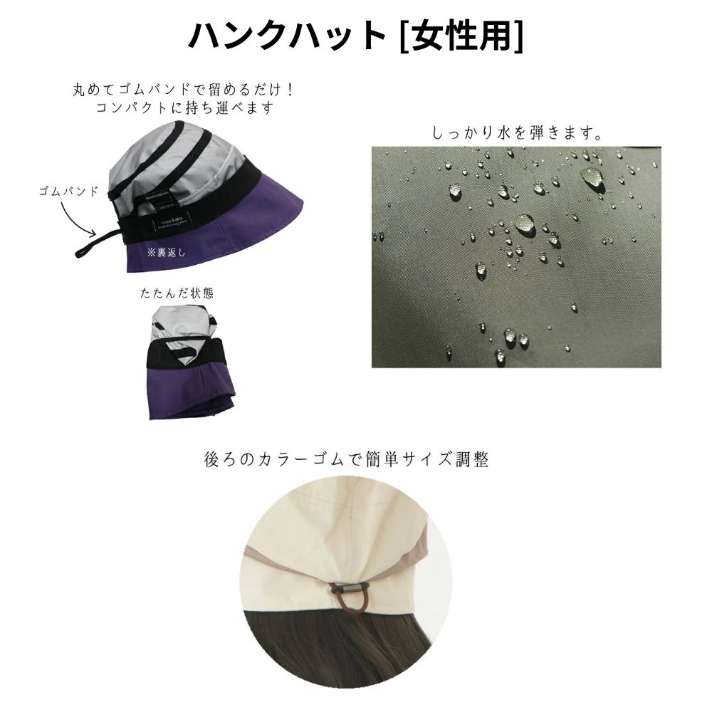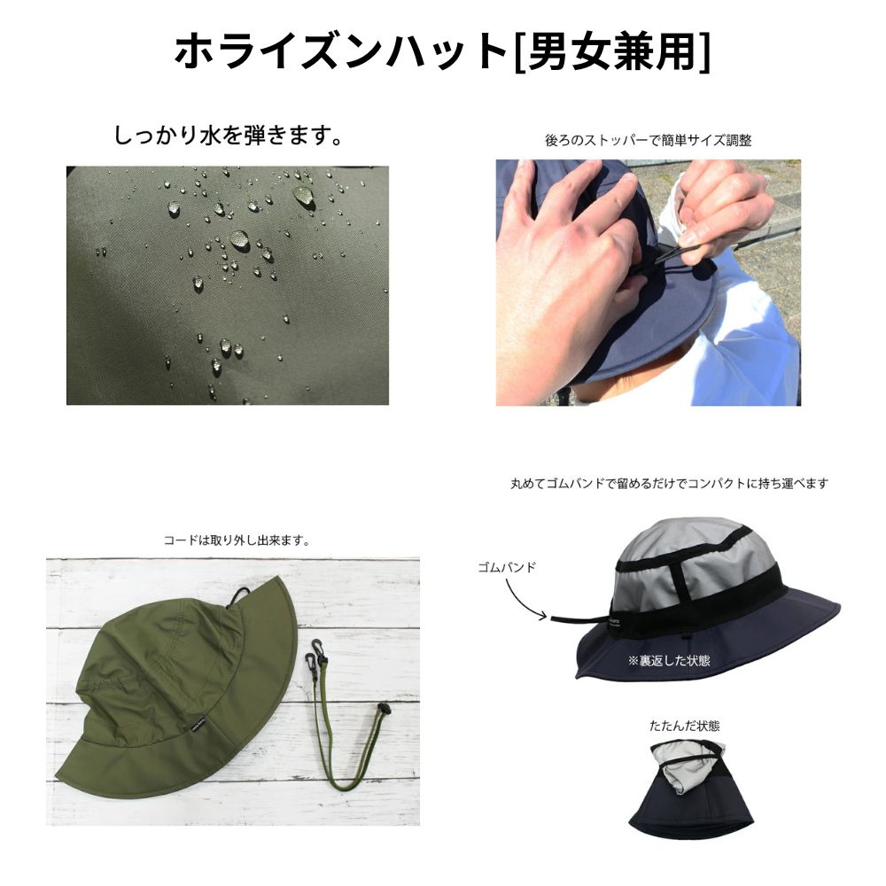 | おすすめポイント | ・撥水、防水、透湿、UVカットなど高機能で軽量な東レコーテックスの素材「ブリザテック®」を使用。 ・紫外線カット機能が頼もしい軽量ハット(紫外線遮蔽率99%以上。UPF値50+。近赤外線遮蔽率75%以上) ・特殊なポリウレタンの微多孔質膜構造による透湿機能で、夏場の帽子内の蒸れも安心。 ・軽量で折りたたみが簡単! 旅行やお出かけの持ち歩きに最適。 ・通院やお薬の受け取り、送迎などのちょっとした機会にも持ち歩きやすい仕様です。 ・選べる2つのデザイン。ゴムでサイズ調整が簡単。 ・国内工場で丁寧に縫製された日本製品質 |