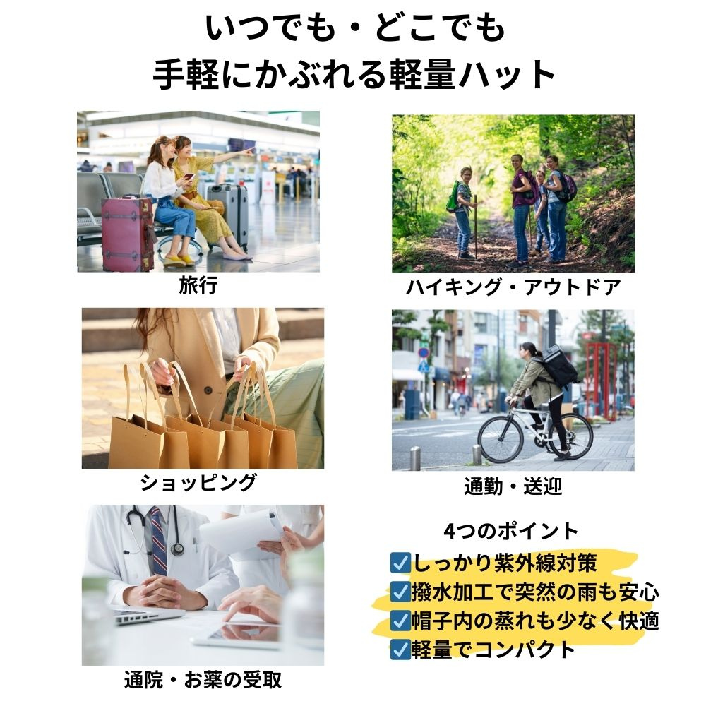 紫外線が気になる季節だけでなく、通年を通して使いやすい軽量ハットです。